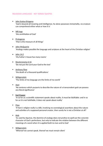A Level Rs Religious Language And Evil Suffering Key Quotes Teaching Resources